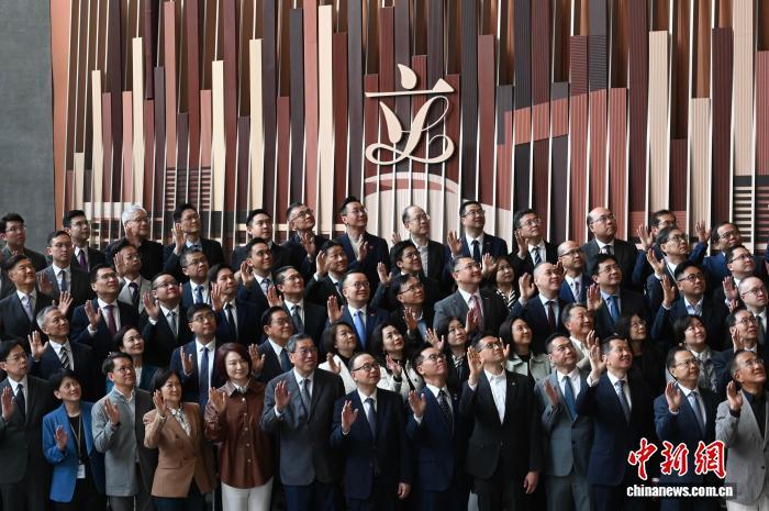 12月9日,香港特别行政区第七届立法会议员和第八届立法会民选议员在立法会综合大楼地下大堂会见传媒。图为第七届立法会议员及第八届立法会新任议员致欢迎辞埃迪亚。供图:中新网记者 李志华