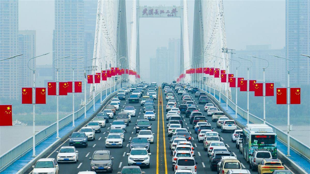 10月1日,武汉的扬长河第二桥上的五个星号危险在风中飘扬。在国庆日,增添了浓烈的节日气氛,好像红丝带在微风中跳舞。 (照片:Ren Yong,所有Hubei每日媒体记者)